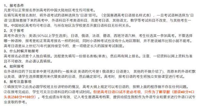 ②在报考完成后,学生可关注日语科目的口语考试时间。但是高考日语口试不是必考项,只作为了解掌握(朗读40分+口头表达60分=100分)。考生成绩当年有效,记入考生普通高考档案,提供给招生院校作为外语专业和要求进行外语口试专业录取的参考。