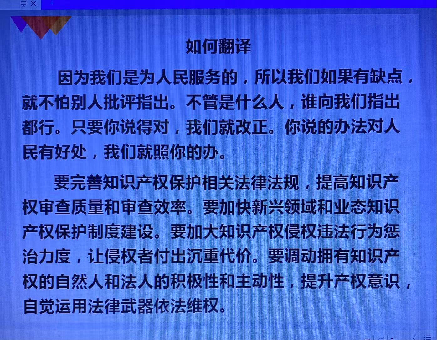 讲座中叶教授带领学生在探讨不同文化之间进行交流的大背景之下作为文化载体的语言之间应有的翻译规律,通过运用翻译技巧与大量翻译实践,总结了对应翻译的双性,即“还原性与再创性”的两大根本原理,以音频与例句为载体引导学生感受对应翻译的效用,体会对应翻译的乐趣,通过比较让大家领会“畅、达、文”是在“信、达、雅”基础上的创新,更加准确地提炼原创思维和精炼再创思维,还可使译笔灵动,遒劲,老辣,神足。